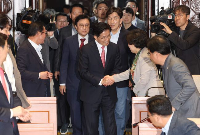 김문수 국민의힘 대선 후보가 11일 오후 서울 여의도 국회에서 열린 의원총회에 참석하며 의원들과 인사하고 있다.