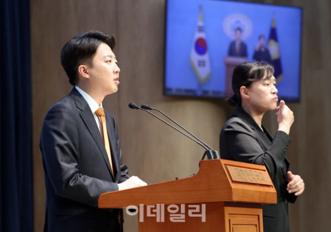 이준석 개혁신당 대선 후보가 12일 오전 서울 여의도 국회 소통관에서 정치 현안 관련 기자회견을 하고 있다.