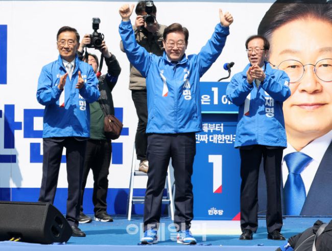 이재명 더불어민주당 대선 후보가 6·3 대통령선거 공식 선거운동 첫날인 12일 서울 광화문 청계광장에서 열린 출정식 및 첫 유세에서 운동복과 운동화를 전달받은 뒤, 손을 번쩍 들고 있다.