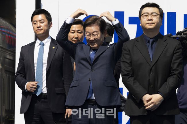이재명 더불어민주당 대선 후보가 6·3 대통령선거 공식 선거운동 첫날인 12일 서울 광화문 청계광장에서 열린 출정식 및 첫 유세에서 하트를 시민들에게 보내고 있다.