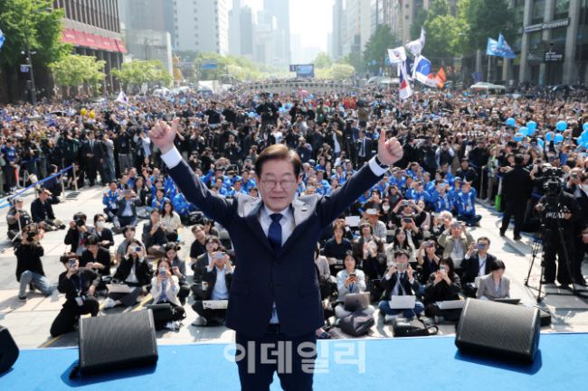 이재명 더불어민주당 대선 후보가 6·3 대통령선거 공식 선거운동 첫날인 12일 서울 광화문 청계광장에서 열린 출정식 및 첫 유세에 서 손을 들어 인사하고 있다.