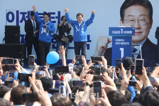 이재명 더불어민주당 대선 후보가 6·3 대통령선거 공식 선거운동 첫날인 12일 경기 화성시 동탄 센트럴파크 음악분수중앙광에서 열린 'K-반도체' 동탄 집중유세에서 시민들에게 인사하고 있다.
