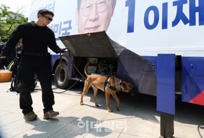12일 오후 경기 동탄 센트럴파크에서 이재명 더불어민주당 대통령 후보의 주변 경찰경호와 경찰특공대 폭발물 탐지견이 탐색하고 있다.