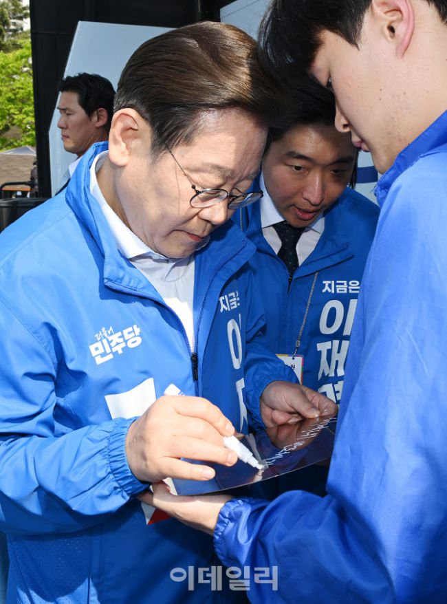 이재명 더불어민주당 대선 후보가 6·3 대통령선거 공식 선거운동 첫날인 12일 경기 화성시 동탄 센트럴파크 음악분수중앙광에서 열린 'K-반도체' 동탄 집중유세에서 지지 호소하며 웨이퍼에 '세계 1위 반도체 강국 도약!'이라 적은 뒤 서명하고 있다.