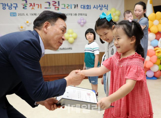 조성명(왼쪽) 강남구청장이 19일 강남구청에서 ‘제36회 어린이 글짓기·그림그리기 대회’ 시상식과 수상작 전시회를 열었다. 이번 대회는 코로나19 이후 처음으로 온라인 공모전에서 현장 대면 방식으로 전환하고, 지난 5월 10일 일원동 마루공원에서 열린 ‘세계다문화축제’와 함께 진행됐다. 총 1,184명의 어린이가 사전 신청했고, 이 중 522점의 작품이 접