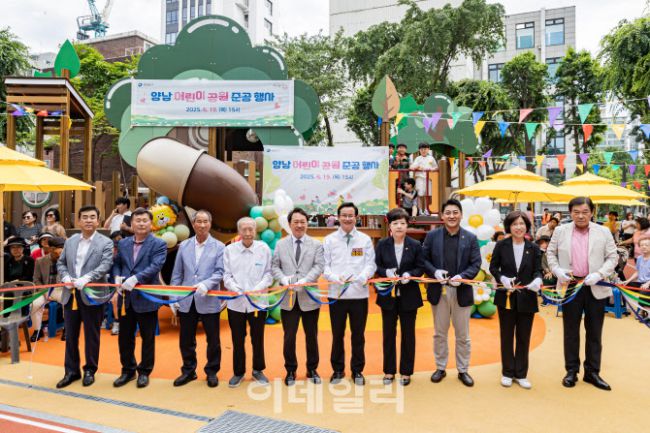 최호권(오른쪽 다섯번째) 영등포구청장이 19일 양평동 양남 어린이공원 준공식에서 참석자들과 기념촬영을 하고 있다. 이날 행사에는 최호권 구청장을 비롯해 시 구의원, 지역 주민 등이 참석했으며, ▲식전공연 및 개회선언 ▲사업 경과 보고 ▲감사장 수여 ▲테이프 커팅 ▲공원 라운딩 등이 진행됐다. 또한 달려라 정원버스 화분만들기, 정원을 여행하는 돌 그리기 등