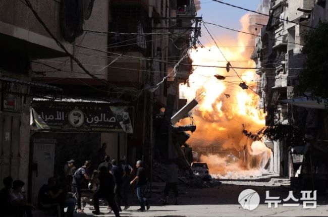 [가자시티 로이터=뉴스핌] 장일현 특파원 = 지난 7일(현지시간) 이스라엘의 폭격으로 팔레스타인 가자지구 내 최대도시인 가자시티의 한 주택가에서 연기와 불길이 치솟고 있다. 2025.09.08. ihjang67@newspim.com 저작권자(c) 글로벌리더의 지름길 종합뉴스통신사 뉴스핌(Newspim), 무단 전재-재배포 금지