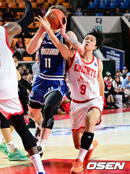 12일 서울 송파구 학생체육관에서 2025-2026 동아시아 슈퍼리그 (EASL) 서울 SK 와 홍콩 이스턴의 경기가 열렸다. SK는 1패를 안고 있고, 홍콩 이스턴은 EASL 시즌 첫 경기다. 4쿼터 SK 김태훈이 홍콩 이스턴을 수비하고 있다. 2025.11.12 /cej@osen.co.kr