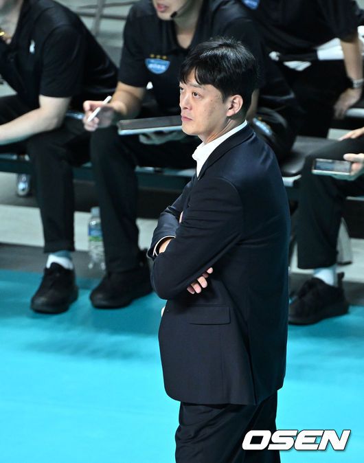 5일 오후 서울 장충체육관에서 프로배구 진에어 2025~26 V리그 GS칼텍스와 페퍼저축은행의 경기가 열렸다. 페퍼저축은행은 6승 5패 승점 17점으로 리그 4위, GS칼텍스는 5승 6패 승점 16점으로 5위에 올라 있다. 2세트 GS칼텍스 이영택 감독이 경기를 바라보고 있다. 2025.12.05 /sunday@osen.co.kr