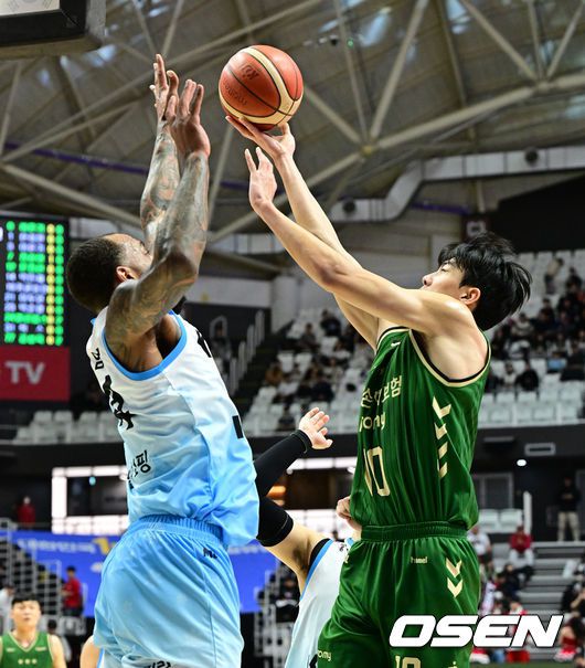 19일 오후 수원 KT 소닉붐 아레나에서 2025-2026 LG전자 프로농구 수원 KT와 원주 DB의 경기가 열렸다. KT는 11승 11패(6위), DB는 12승 9패(4위)를 기록중이다.1쿼터 DB 김보배가 KT 윌리엄스의 수비를 피해 슛을 시도하고 있다. 2025.12.19 /jpnews@osen.co.kr