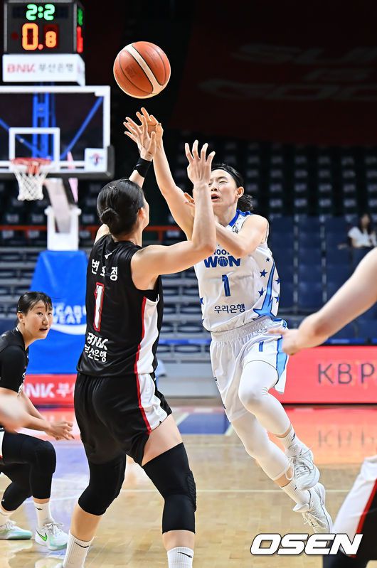 19일 부산 사직실내체육관에서 BNK금융 2025~2026 여자프로농구 부산 BNK와 아산 우리은행의 경기가 열렸다. 시즌 첫 3연승을 달리고 있는 부산 BNK와 아산 우리은행이 연승 행진을 이어가기 위해 맞대결을 펼친다. 아산 우리은행 강계리가 부산 BNK 변소정의 마크를 피해 3점슛을 시도하고 있다. 2025.12.19 / foto0307@osen.co