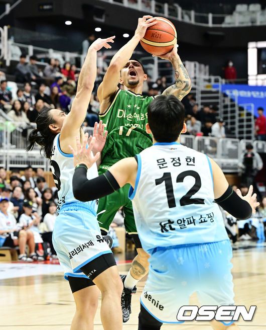 19일 오후 수원 KT 소닉붐 아레나에서 2025-2026 LG전자 프로농구 수원 KT와 원주 DB의 경기가 열렸다. KT는 11승 11패(6위), DB는 12승 9패(4위)를 기록중이다.1쿼터 DB 이선 알바노가 슛을 시도하고 있다. 2025.12.19 /jpnews@osen.co.kr