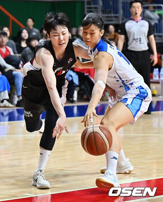 19일 부산 사직실내체육관에서 BNK금융 2025~2026 여자프로농구 부산 BNK와 아산 우리은행의 경기가 열렸다. 시즌 첫 3연승을 달리고 있는 부산 BNK와 아산 우리은행이 연승 행진을 이어가기 위해 맞대결을 펼친다. 아산 우리은행 변하정이 부산 BNK 박혜진의 볼을 가로채고 있다. 2025.12.19 / foto0307@osen.co.kr