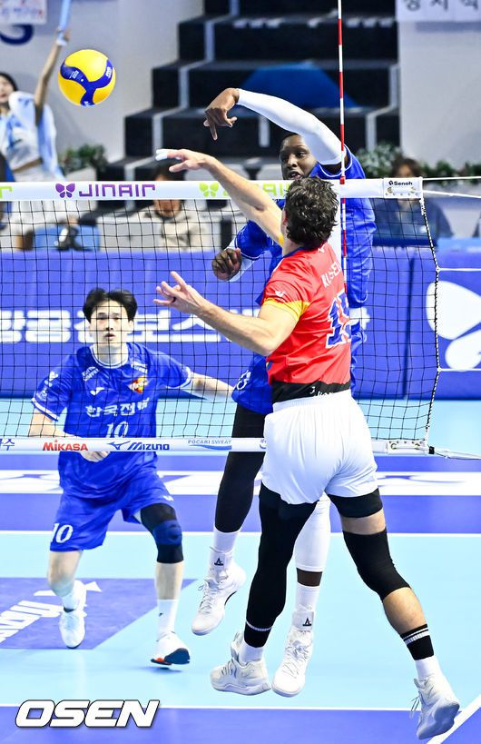 19일 오후 인천 계양체육관에서 진에어 2025-2026 V리그 남자부 대한항공과 한국전력의 경기가 진행됐다. 홈팀 대한항공은 1위(12승 2패·승점 34), 어웨이팀 한국전력은 5위(8승 6패·승점 22)에 위치하고 있다. 2세트 한국전력 베논이 오버넷 반칙을 하고 있다 2025.12.19 / soul1014@osen.co.kr