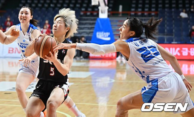 19일 부산 사직실내체육관에서 BNK금융 2025~2026 여자프로농구 부산 BNK와 아산 우리은행의 경기가 열렸다. 시즌 첫 3연승을 달리고 있는 부산 BNK와 아산 우리은행이 연승 행진을 이어가기 위해 맞대결을 펼친다. 부산 BNK 안혜지가 아산 우리은행 김단비의 마크를 피해 골밑돌파를 시도하고 있다. 2025.12.19 / foto0307@osen.c
