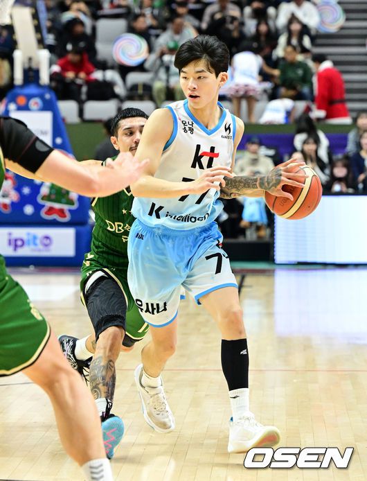 19일 오후 수원 KT 소닉붐 아레나에서 2025-2026 LG전자 프로농구 수원 KT와 원주 DB의 경기가 열렸다. KT는 11승 11패(6위), DB는 12승 9패(4위)를 기록중이다.3쿼터 DB 알바노가 KT 강성욱의 볼을 가로채고 있다. 2025.12.19 /jpnews@osen.co.kr