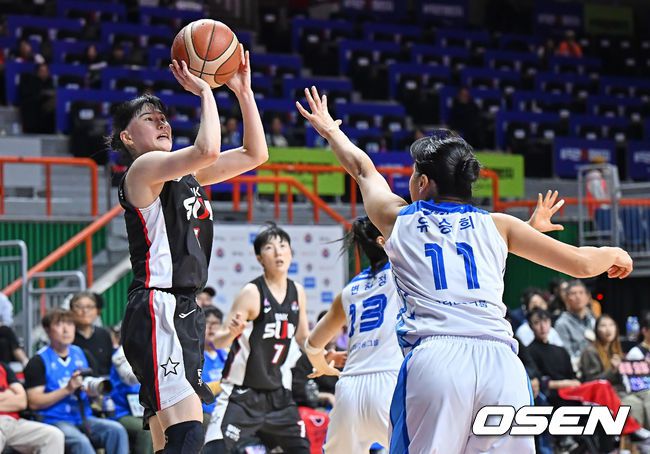 19일 부산 사직실내체육관에서 BNK금융 2025~2026 여자프로농구 부산 BNK와 아산 우리은행의 경기가 열렸다. 시즌 첫 3연승을 달리고 있는 부산 BNK와 아산 우리은행이 연승 행진을 이어가기 위해 맞대결을 펼친다. 부산 BNK 이소희가 아산 우리은행 유승희의 마크를 피해 골밑슛을 시도하고 있다. 2025.12.19 / foto0307@osen.co
