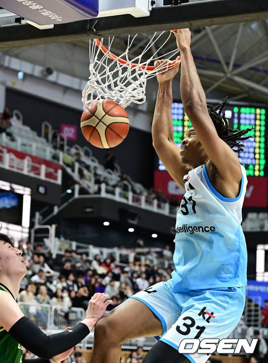 19일 오후 수원 KT 소닉붐 아레나에서 2025-2026 LG전자 프로농구 수원 KT와 원주 DB의 경기가 열렸다. KT는 11승 11패(6위), DB는 12승 9패(4위)를 기록중이다.3쿼터 KT 힉스가 투핸드 덩크를 성공시키고 있다. 2025.12.19 /jpnews@osen.co.kr