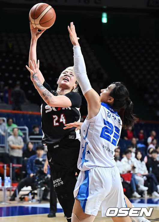 19일 부산 사직실내체육관에서 BNK금융 2025~2026 여자프로농구 부산 BNK와 아산 우리은행의 경기가 열렸다. 시즌 첫 3연승을 달리고 있는 부산 BNK와 아산 우리은행이 연승 행진을 이어가기 위해 맞대결을 펼친다. 부산 BNK 김소니아가 아산 우리은행 김단비의 마크를 피해 골밑슛을 시도하고 있다. 2025.12.19 / foto0307@osen.c