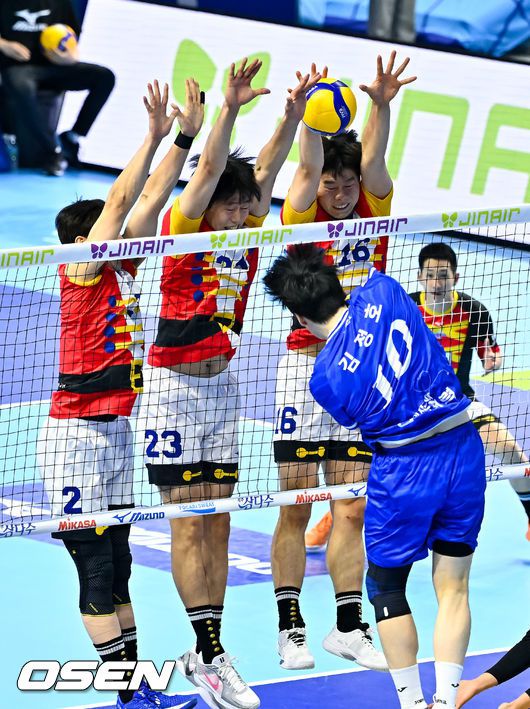 대한항공이 올해 마지막 홈경기에서 팬들에게 완벽한 성탄 선물을 선사했다. 대한항공은 19일 인천 계양체육관에서 진행된 한국전력과 진에어 2025~2026 V리그 홈경기에서 세트스코어 3-0(25-22, 25-14, 26-24) 셧아웃 승리를 거뒀다. 1세트 대한항공 정한용이 블로킹 성공시키고 있다. 2025.12.19 / soul1014@osen.co.kr