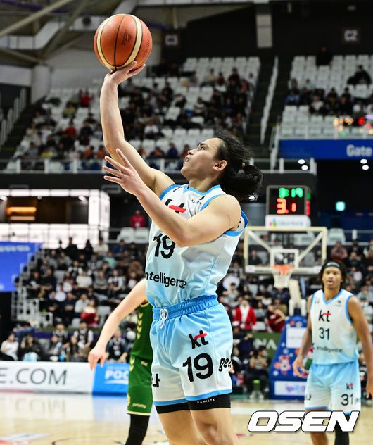 19일 오후 수원 KT 소닉붐 아레나에서 2025-2026 LG전자 프로농구 수원 KT와 원주 DB의 경기가 열렸다. KT는 11승 11패(6위), DB는 12승 9패(4위)를 기록중이다.4쿼터 KT 카굴랑안이 득점에 성공하고 있다. 2025.12.19 /jpnews@osen.co.kr
