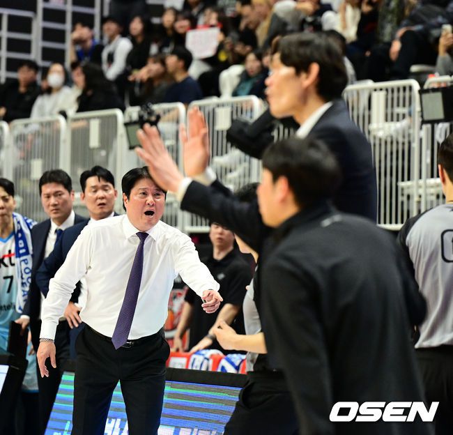 19일 오후 수원 KT 소닉붐 아레나에서 2025-2026 LG전자 프로농구 수원 KT와 원주 DB의 경기가 열렸다. 이날 DB가 KT에 83-81로 짜릿한 역전 승리를 거뒀다. 헨리 엘런슨이 38점 12리바운드로 맹활약을 펼쳤다.4쿼터 KT 문경은 감독이 심판 판정에 불만을 나타내고 있다. 2025.12.19 /jpnews@osen.co.kr