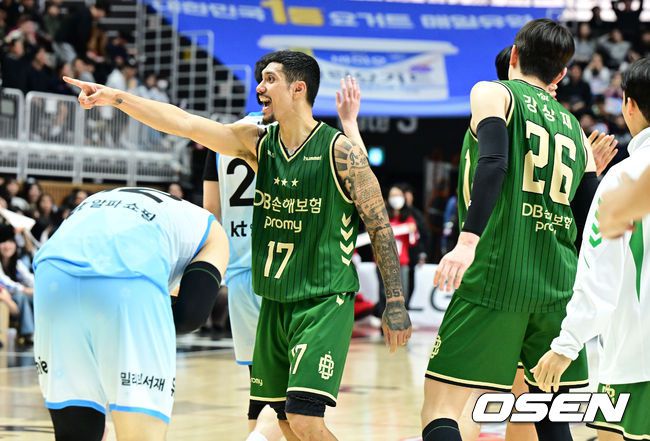 19일 오후 수원 KT 소닉붐 아레나에서 2025-2026 LG전자 프로농구 수원 KT와 원주 DB의 경기가 열렸다. 이날 DB가 KT에 83-81로 짜릿한 역전 승리를 거뒀다. 헨리 엘런슨이 38점 12리바운드로 맹활약을 펼쳤다.경기를 마치고 DB 알바노가 승리를 기뻐하고 있다. 2025.12.19 /jpnews@osen.co.kr