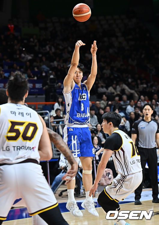 26일 부산 사직체육관에서 2025-2026 LG전자 프로농구 부산 KCC와 창원 LG의 경기가 열렸다. 7연승을 달리고 있는 KCC가 부상 악재 속에서도 허훈을 앞세워 유기상·마레이·타마요가 버티는 챔피언 LG를 상대로 2전3기 끝 승리에 도전한다. 부산 KCC 윤기찬이 창원 LG 윤원상의 마크를 피해 3점슛을 시도하고 있다. 2025.12.26 / fo