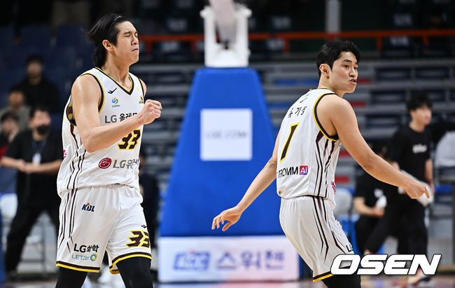 26일 부산 사직체육관에서 2025-2026 LG전자 프로농구 부산 KCC와 창원 LG의 경기가 열렸다. 7연승을 달리고 있는 KCC가 부상 악재 속에서도 허훈을 앞세워 유기상·마레이·타마요가 버티는 챔피언 LG를 상대로 2전3기 끝 승리에 도전한다. 창원 LG 칼 타마요와 유기상이 정인덕의 3점슛 성공에 기뻐하고 있다. 2025.12.26 / foto03