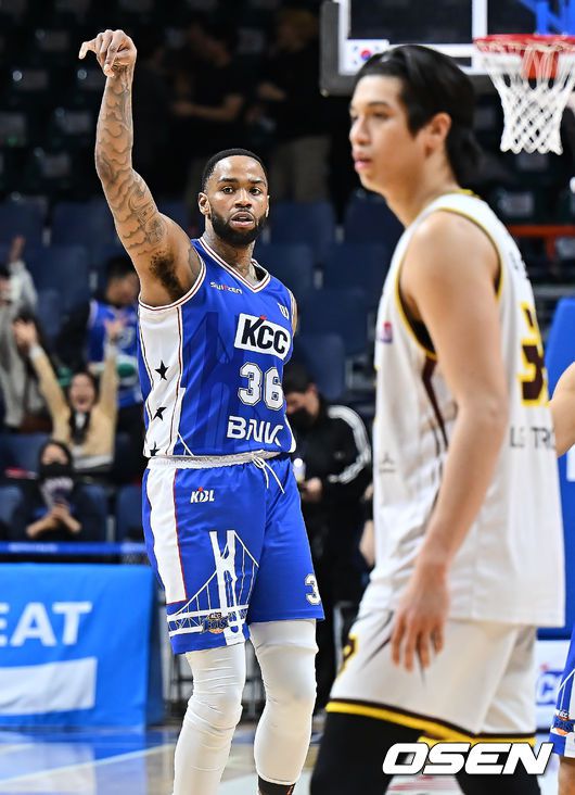 26일 부산 사직체육관에서 2025-2026 LG전자 프로농구 부산 KCC와 창원 LG의 경기가 열렸다. 7연승을 달리고 있는 KCC가 부상 악재 속에서도 허훈을 앞세워 유기상·마레이·타마요가 버티는 챔피언 LG를 상대로 2전3기 끝 승리에 도전한다. 부산 KCC 숀롱이 4쿼터 연장전에 돌입하게 만든 동점 3점슛을 성공시키고 세리머니를 하고 있다. 2025