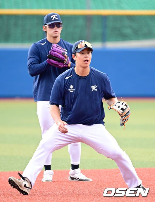 2026 WBC(월드베이스볼클래식)를 준비하는 대한민국 야구 대표팀이 24일 일본 오키나와 가데나 야구장에서 프로야구 KIA 타이거즈와 연습경기를 펼쳤다. 야구 대표팀은 오키나와에서 국내 팀들과 6차례 연습경기를 치르며 전력을 끌어올릴 예정이다. 대표팀 노시환과 김도영이 수비 훈련을 펼치고 있다. 2026.02.24 / dreamer@osen.co.kr