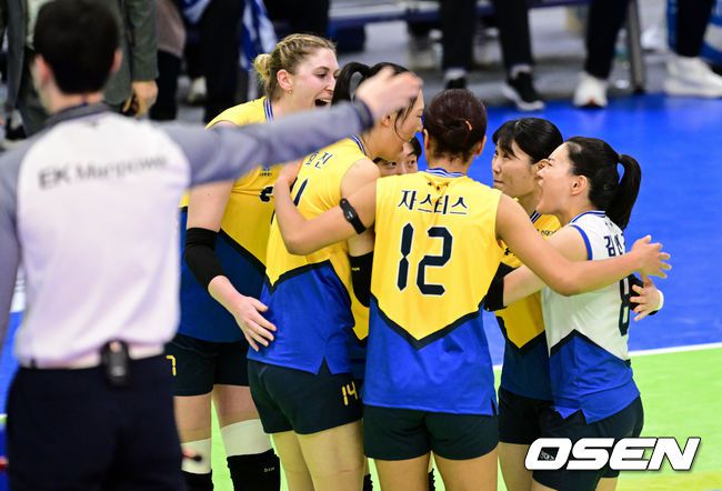 24일 수원체육관에서 ‘진에어 2025~2026 프로배구 V리그’ 여자부 현대건설과 한국도로공사의 경기가 열렸다. 현대건설은 19승11패(승점 56)로 리그 2위를, 한국도로공사는 21승 9패(승점59)로 1위를 기록 중이다. 1세트 현대건설이 세트포인트에 기뻐하고 있다. 2026.02.24 /cej@osen.co.kr