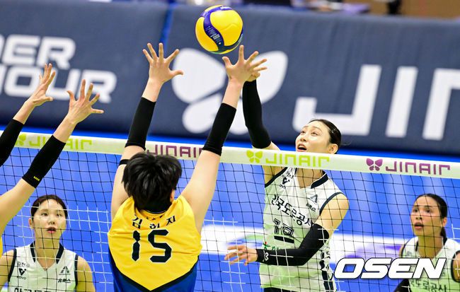 24일 수원체육관에서 ‘진에어 2025~2026 프로배구 V리그’ 여자부 현대건설과 한국도로공사의 경기가 열렸다. 현대건설은 19승11패(승점 56)로 리그 2위를, 한국도로공사는 21승 9패(승점59)로 1위를 기록 중이다. 1세트 한국도로공사 배유나가 밀어넣기를 하고 있다. 2026.02.24 /cej@osen.co.kr
