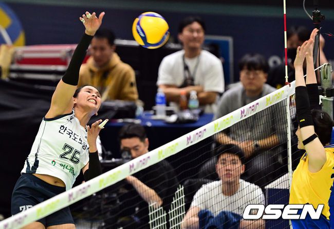 24일 수원체육관에서 ‘진에어 2025~2026 프로배구 V리그’ 여자부 현대건설과 한국도로공사의 경기가 열렸다. 현대건설은 19승11패(승점 56)로 리그 2위를, 한국도로공사는 21승 9패(승점59)로 1위를 기록 중이다. 1세트 한국도로공사 타나차가 강타를 하고 있다. 2026.02.24 /cej@osen.co.kr