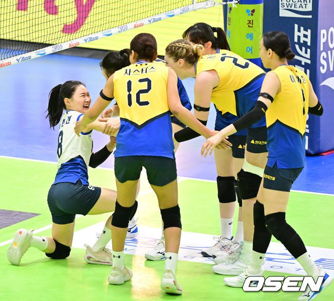5일 오후 수원체육관에서 ‘진에어 2025~2026 프로배구 V리그’ 여자부 현대건설과 흥국생명의 경기가 열렸다. 6연승 현대건설은 2위(21승 11패, 승점 61), 3연패 흥국생명은 3위(17승 16패, 승점 53)을 기록 중이다. 4세트 현대건설 리베로 김연견의 득점에 동료선수들이 기뻐하고 있다. 2026.03.05 /jpnews@osen.co.kr
