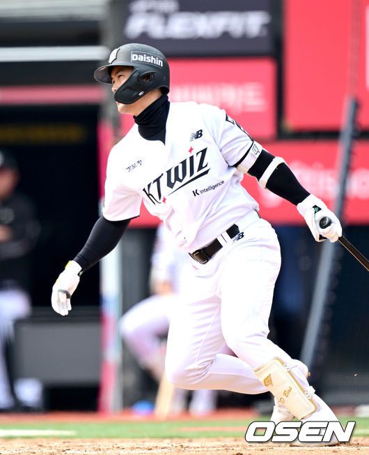 16일 경기도 수원 KT위즈파크에서 ‘2026 신한 SOL KBO리그’ 시범경기 KT 위즈와 LG 트윈스의 경기가 열린다. 홈팀 KT는 권성준, 방문팀 LG는 라클란 웰스를 선발 투수로 내세웠다. 2회말 2사 만루 상황 KT 배정대가 동점 1타점 적시타를 날리고 있다. 2026.03.16 / dreamer@osen.co.kr