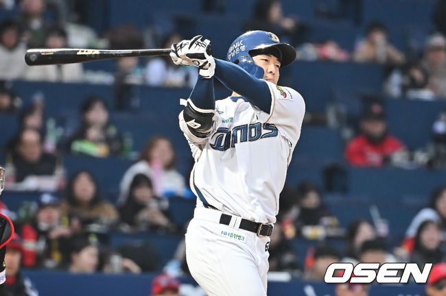 16일 창원NC파크에서 2026 신한 SOL KBO 리그 시범경기 NC 다이노스와 KIA 타이거즈의 경기가 열렸다. 홈팀 NC는 구창모가, 방문팀 KIA는 황동하가 선발 출전했다. NC 다이노스 오장한이 5회말 무사 1,3루 좌중간 1타점 2루타를 치고 있다. 2026.03.16 / foto0307@osen.co.kr