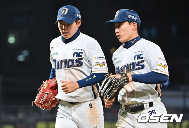 16일 창원NC파크에서 2026 신한 SOL KBO 리그 시범경기 NC 다이노스와 KIA 타이거즈의 경기가 열렸다. 홈팀 NC는 구창모가, 방문팀 KIA는 황동하가 선발 출전했다. NC 다이노스 한재환, 신재인이 7회초 1사 1,2루 KIA 타이거즈 박정우를 2루수 병살로 잡고 교대하고 있다. 2026.03.16 / foto0307@osen.co.kr