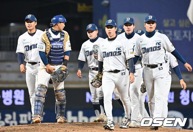 16일 창원NC파크에서 2026 신한 SOL KBO 리그 시범경기 NC 다이노스와 KIA 타이거즈의 경기가 열렸다. 홈팀 NC는 구창모가, 방문팀 KIA는 황동하가 선발 출전했다. NC 다이노스 선수들이 4-3으로 승리한 후 기쁨을 나누고 있다. 2026.03.16 / foto0307@osen.co.kr