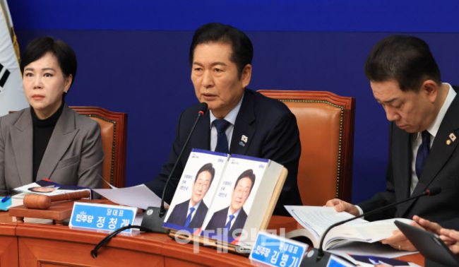 정청래 더불어민주당 대표가 5일 오전 서울 여의도 국회에서 열린 제21대 대통령선거 백서 발간 시연회에서 인사말을 하고 있다.