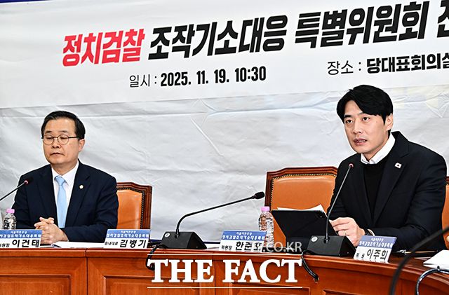 한준호 더불어민주당 정치검찰조작기소대응특위 위원장(오른쪽)이 19일 오전 서울 여의도 국회에서 열린 정치검찰 조작기소대응특위 전체회의에 참석해 모두발언을 하고 있다. hany@tf.co.kr 사진영상기획부 photo@tf.co.kr 발로 뛰는 더팩트는 24시간 여러분의 제보를 기다립니다. ▶카카오톡: '더팩트제보' 검색 ▶이메일: jebo@tf.co.kr