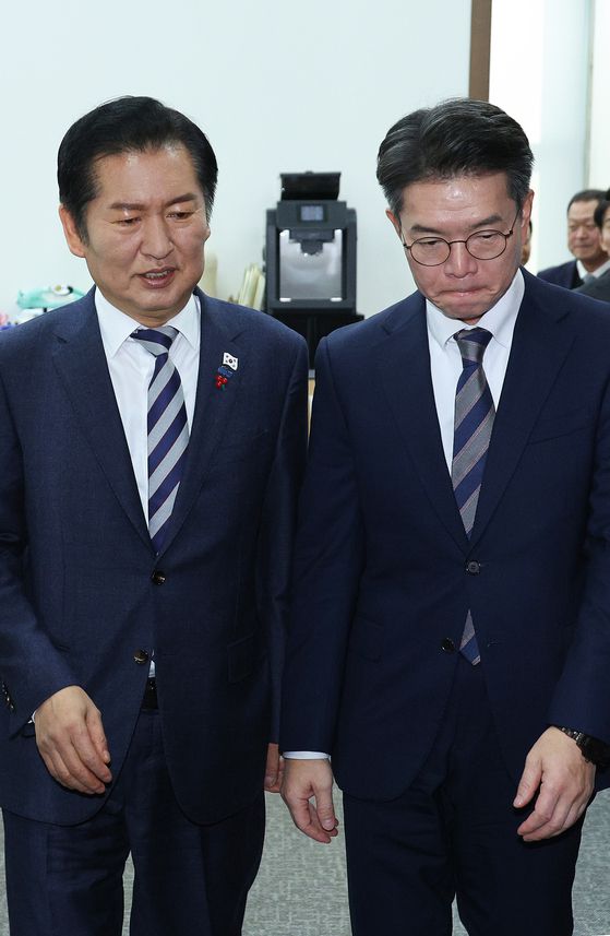 정청래 더불어민주당 대표(왼쪽)와 정원오 서울 성동구청장이 18일 비공개로 면담한 뒤 국회 당대표실을 나서고 있다. 정 구청장은 여권의 서울시장 후보군으로 꼽힌다. [뉴스1] ▶ 중앙일보 / '페이스북' 친구추가 ▶ 넌 뉴스를 찾아봐? 난 뉴스가 찾아와! ⓒ중앙일보(https://www.joongang.co.kr), 무단 전재 및 재배포 금지
