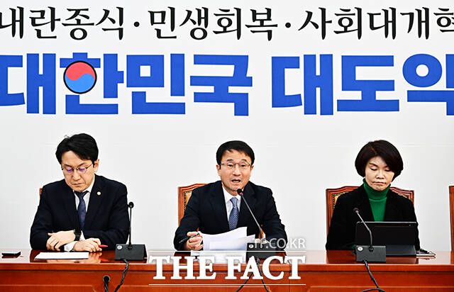 한병도 더불어민주당 원내대표(가운데)가 20일 오전 서울 여의도 국회에서 열린 원내대책회의에 참석해 모두발언을 하고 있다. /국회=배정한 기자 한병도 더불어민주당 원내대표(가운데)가 20일 오전 서울 여의도 국회에서 열린 원내대책회의에 참석해 모두발언을 하고 있다. 한 원내대표는 이날 국민의힘을 향해 "민주당의 입장은 한결같다. 통일교와 신천지 함께 특검하