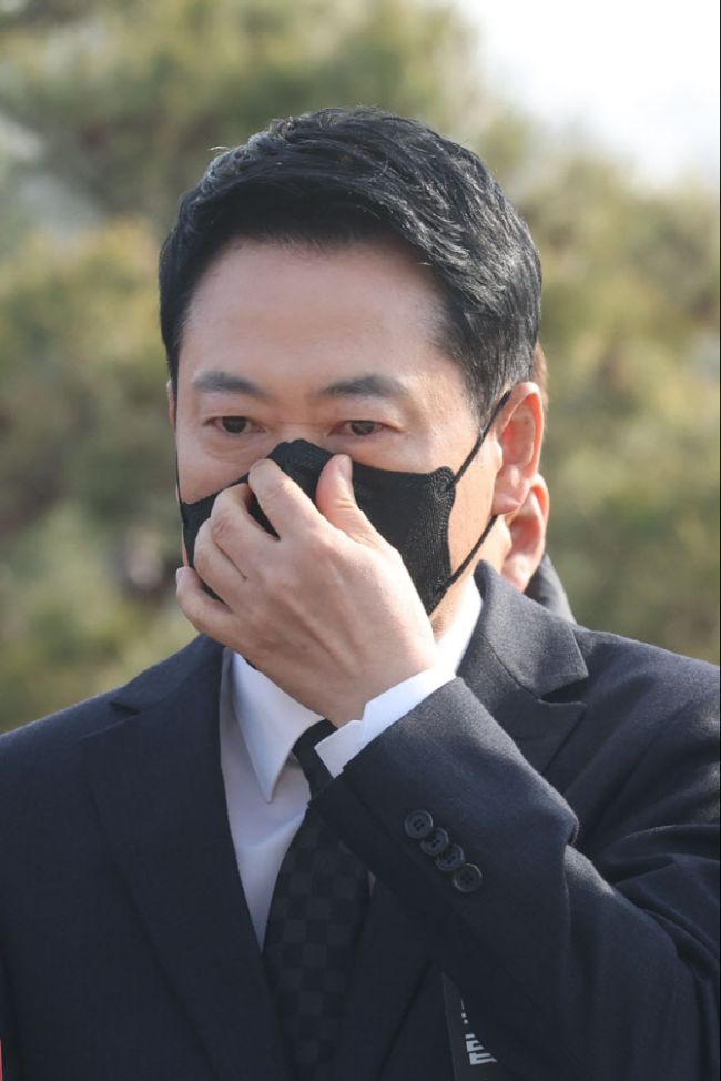 장동혁 국민의힘 대표가 5일 서울 종로구 청와대 사랑채 앞에서 의원총회에서 마스크를 쓰고 있다. 장동혁 국민의힘 대표가 5일 서울 종로구 청와대 사랑채 앞에서 의원총회에서 마스크를 쓰고 있다.