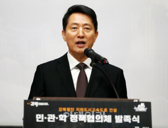 오세훈 서울시장이 16일 서울시청에서 열린 ‘강북횡단 지하도시고속도로 정책협의체 발족식’에서 인사말을 하고 있다. 서울시는 내부순환로 성산IC부터 북부간선도로 신내IC까지 20.5km 구간 낡은 고가차도를 철거하고 지하에 2037년까지 도시공간을 재편할 계획이다. 협의체는 6개 자치구 대표와 분야별 전문가로 구성되어 타당성과 대안을 검토하게 된다. 오세훈