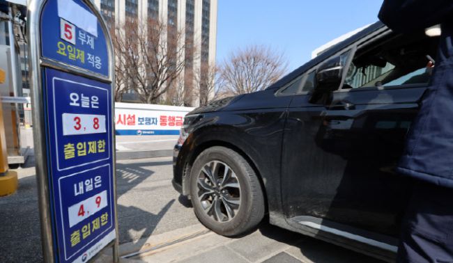 공공부문 승용차 5부제(요일제) 의무 시행 첫날인 25일 오전 서울 종로구 정부서울청사에서 차량5부제 안내문이 붙어 있다.차량 5부제는 자동차번호판 끝 번호에 따라 요일별로 운행을 제한하는 제도로 끝 번호 1·6번은 월요일, 2·7번은 화요일, 3·8번은 수요일, 4·9번은 목요일, 5·0번은 금요일에 각각 운행이 제한되며 주말과 공휴일은 적용되지 않는다.