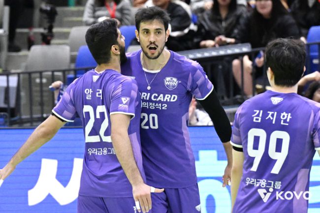 우리카드 아라우조(가운데)와 알리(왼쪽에서 첫 번째)가 환호하고 있다. 사진 | 한국배구연맹 우리카드가 새 외국인 선수 아라우조와 함께 더 강해져 돌아왔다. 마우리시오 파에스 감독이 이끄는 우리카드 20일 수원체육관에서 열린 진에어 2025~2026 V리그 남자부 개막전에서 세트 스코어 3-0으로 셧아웃 승리를 따냈다. 우리카드는 이번시즌 외국인 선수로 브