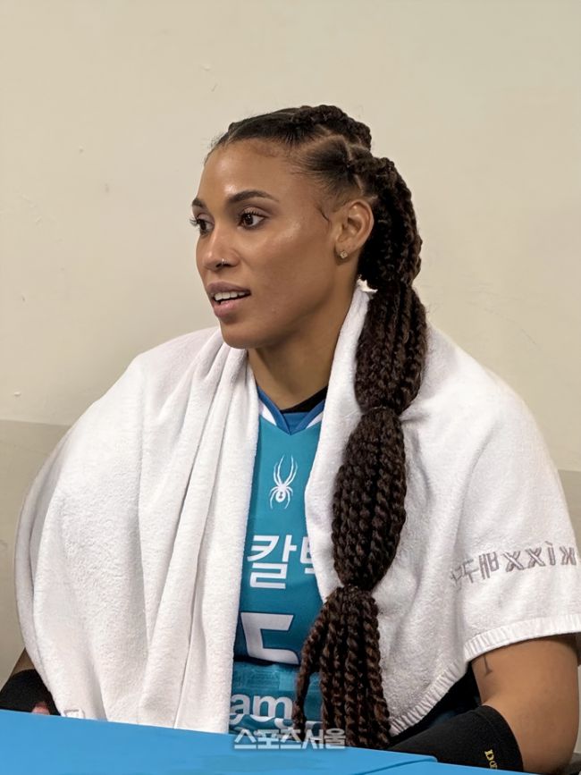 GS칼텍스 실바가 24일 장충체육관에서 열린 흥국생명과의 준플레이오프서 승리한 뒤 기자회견에 임하고 있다.장충 | 정다워 기자 “I‘m fine.” GS칼텍스 외국인 선수 실바는 24일 서울 장충체육관에서 열린 흥국생명과의 진에어 2025~2026 V리그 여자부 준플레이오프에서 무려 42득점을 책임지며 팀의 세트스코어 3-1 승리를 이끌었다. 실바의 활약으