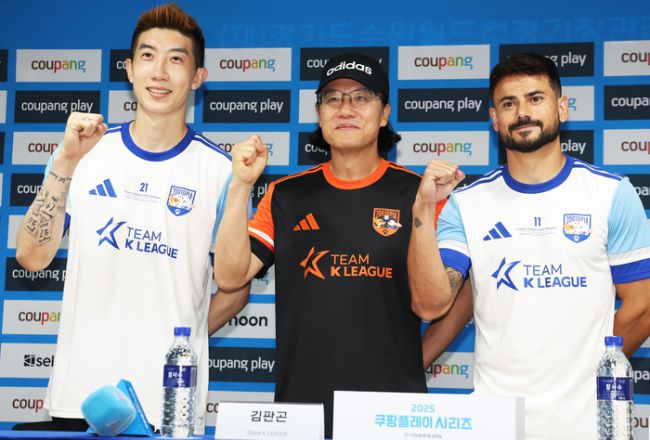 팀K리그 조현우(왼쪽부터), 김판곤 감독, 세징야가 29일 뉴캐슬과 쿠팡시리즈 경기를 앞두고 열린 기자회견에서 단체 사진을 촬영하고 있다. 사진 | 수원=연합뉴스 팀K리그(K리그 올스타)는 허투루 뉴캐슬 유나이티드와 쿠팡플레이 시리즈를 치를 생각이 없다. 팀K리그는 잉글랜드 프리미어리그(EPL) 뉴캐슬 유나이티드와 2025 쿠팡플레이 시리즈 1차전을 하루
