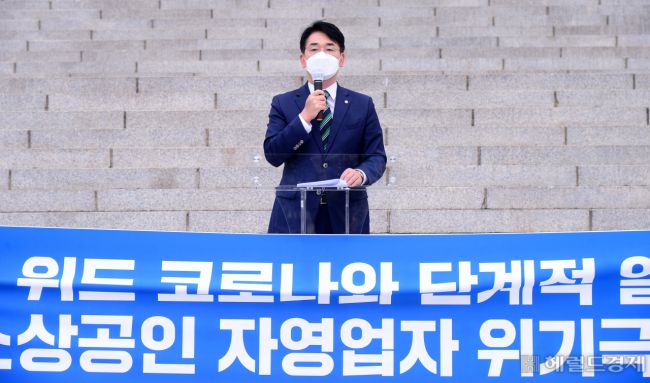 27일 서울 여의도 국회 본관 앞에서 박용진 더불어민주당 대선 경선후보가 '위드 코로나와 단계적 일상회복 & 소상공인 자영업자 위기극복' 관련 기자회견을 하고 있다. babtong@heraldcorp.com Copyright ⓒ 헤럴드경제 All Rights Reserved.